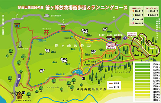 | 高地トレーニングエリア、国内最大級のスケール!笹ヶ峰クロスカントリーエリア(標高1,300m地内)妙高市が誇る当所きっての絶景地「笹ヶ峰高原」になんと、5kmコース・2kmコース等のクロスカントリーコースを整備いたしました。難易度や距離を自由自在に選択してトレーニングが出来ます。また、コースの大半は終日“木洩れ日の中”、直射日光のない最適環境です。妙高山の南麓に広がる笹ヶ峰高原。真夏でも25℃前後の冷涼なこの高原内のクロスカントリーコースで行う準高地トレーニングを是非ご検討ください。コースにはウッドチップがひいてあり、膝への負担が軽くなっています。 |