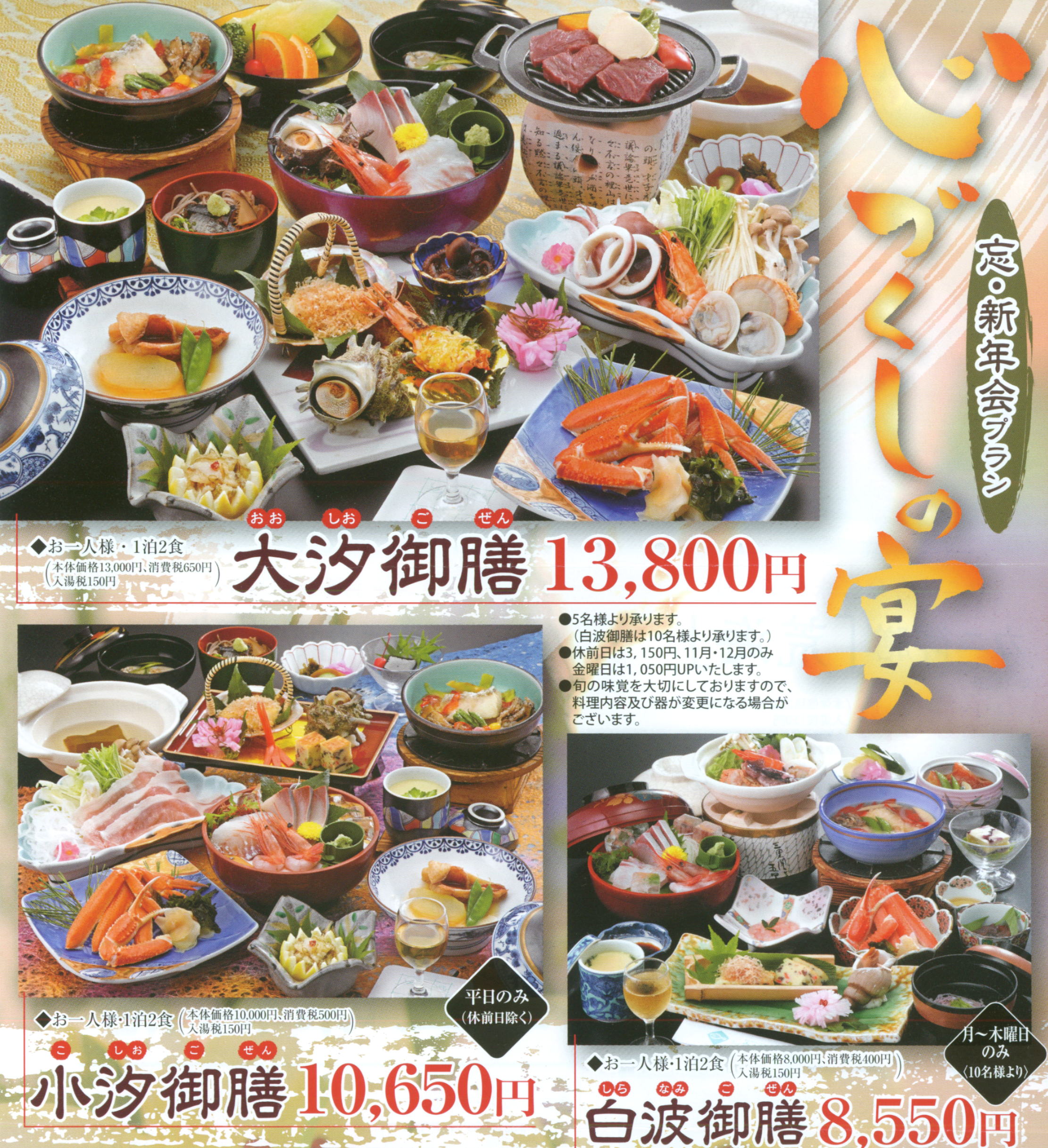 5名様以上でお申込み下さい。(白波御膳のみ10名様より) |